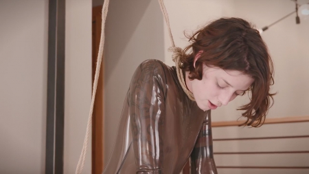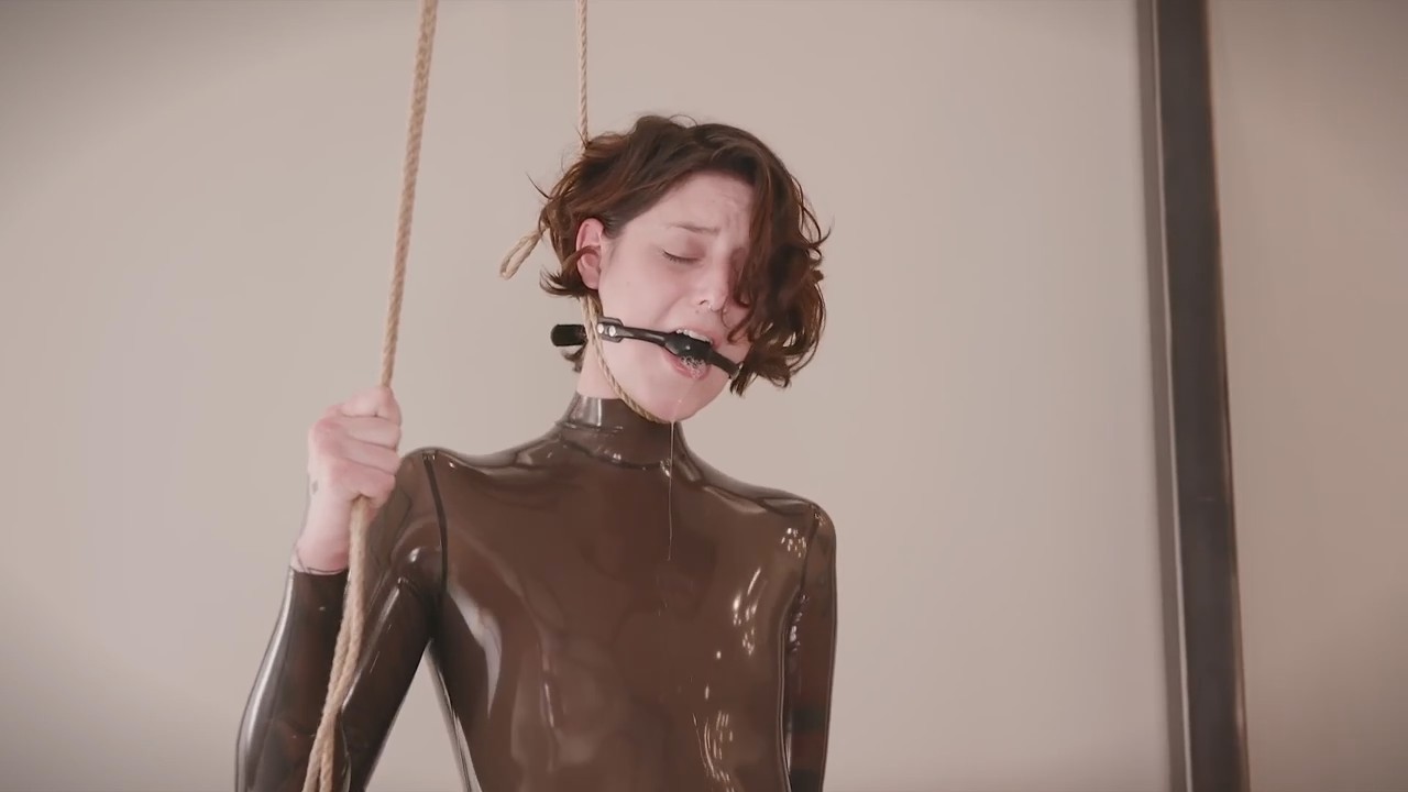 Изучившая шибари искусство телочка в латексе привязала вибратор к левой ноге. На шею себе хрупкая девушка накинула удавку, которую она тянет рукой, придушивая себя ею. Об опасности данного развлечения гласит дисклеймер, это действительно смертельно рискованно, но наша героиня не первый раз доводит себя до экстаза собачьим кайфом, капая слюной из-под кляпа. Когда слишком много одинаково кончаешь, хочется разнообразия.