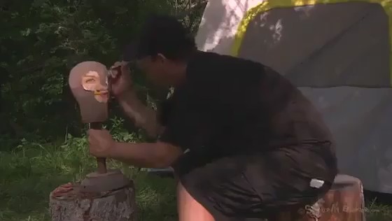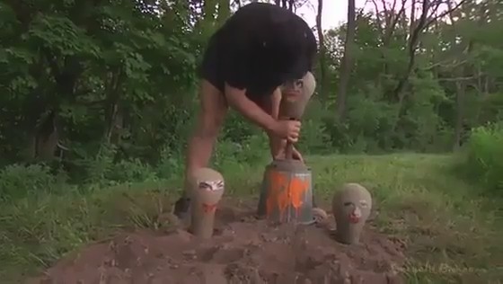 Мужчина придумал довольно извращенную игру. Он закопал симпатягу в землю по самое горло. А потом накрыл голову ведром, выставил еще две мишени и начал стрелять по ним краской. А потом убрал ведро и начал насиловать беспомощную жертву в рот, глубоко засовывая член в глотку. Отымев хорошенькую милашку, мужик кончил ей в ротик, а потом выкопал и связанную увез из леса.