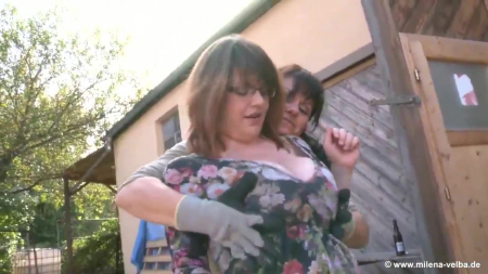 Штукатурщица-малярша подзаебалась работать со стеной, поэтому бросила штукатурную лопатку обратно в ведро и хлебнула пива глядя как мимо проходит очкастая мамочка с коляской. Пьянь тут же подскочила к незнакомке и стала нагло лапать ее огромные сиськи, а ранее мы могли убедиться, что и у самой главной героини они еще больше, просто даме захотелось немного свежего молочка и, расположившись поудобней и отставив коляску в сторону, милфы начали лапать друг другу дыни и брызгать молоком Милене в рот и на вытащенные наружу дойки под открытым небом.