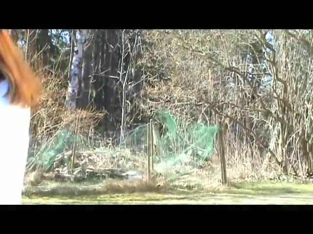 Девушка с очень стройными ногами в голубых джинсах пробиралась в сторону дома по частной территории. Так как полицейских здесь в округе нет от слова совсем, свои владения охраняет сам хозяин - толстый фриц, побежавший за незнакомкой с веревкой в заднем кармане. Он догнал нарушительницу, привязал ее руки к ветке дерева, задрал ее верх и спустил штаны, начав тереться членом о влагалище лицом к лицу. После этого пухлый извращенец развернул девчонку к себе задницей и отымел ее рачком, но ему снова захотелось потереться писюном и обкончать лобок прежде, чем отпустить девку.